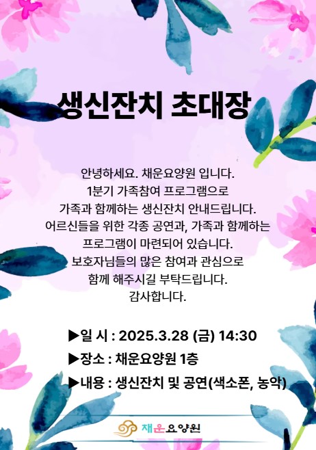 제목 | 2025년 1분기 가족참여프로그램(생신잔치)초대장 | 공지일 | 2025.03.24 |